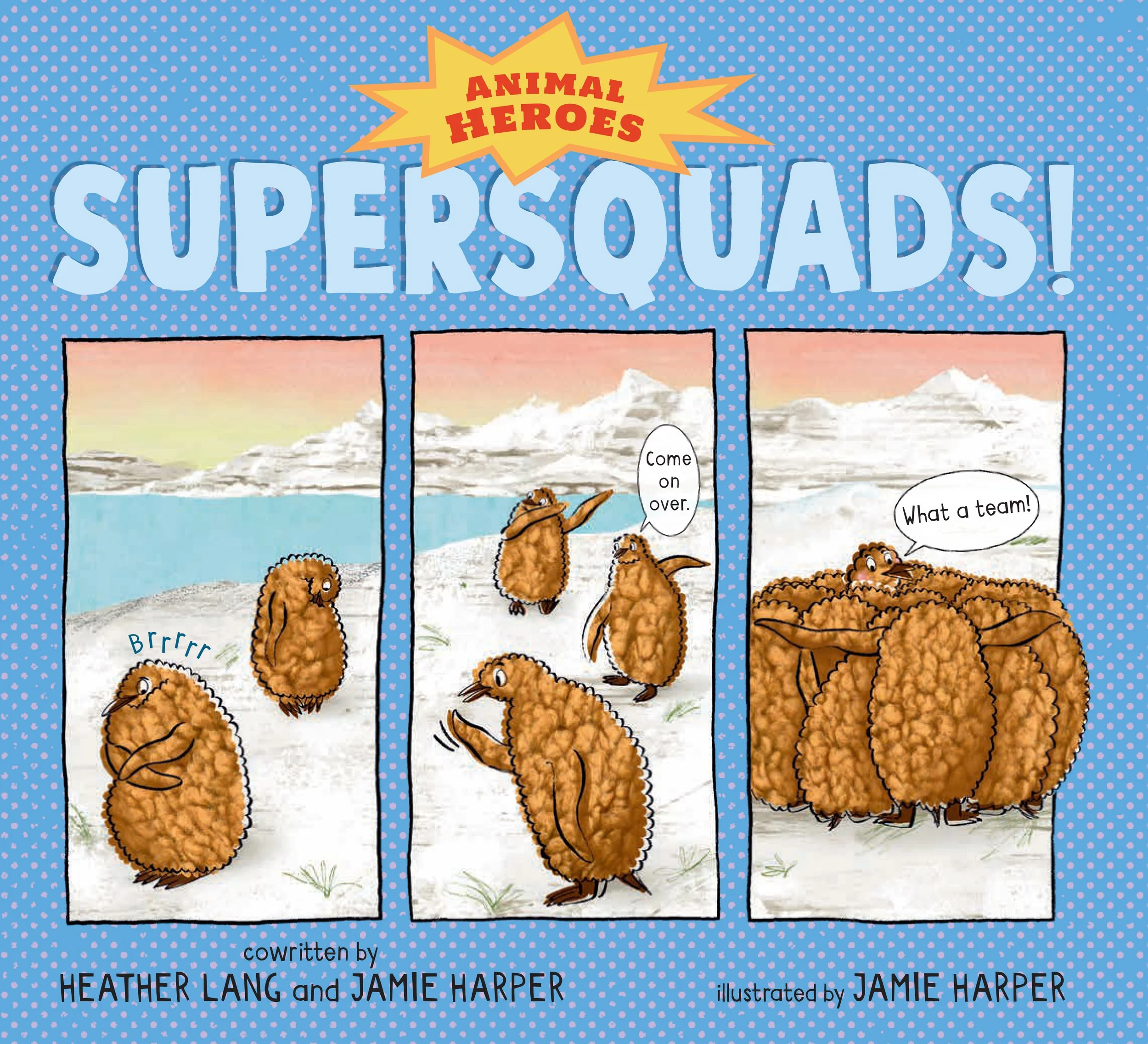 Give a rousing cheer for animals that help one another out. In the same exuberant vein as their salutes to “super” animal moms and dads, Lang and Harper pay tribute to natural friends, families, and communities that work as “supersquads” . . . Succinct explanations of how each collective task or relationship functions accompany Harper’s lively cartoon views of creatures in animated poses. . . .